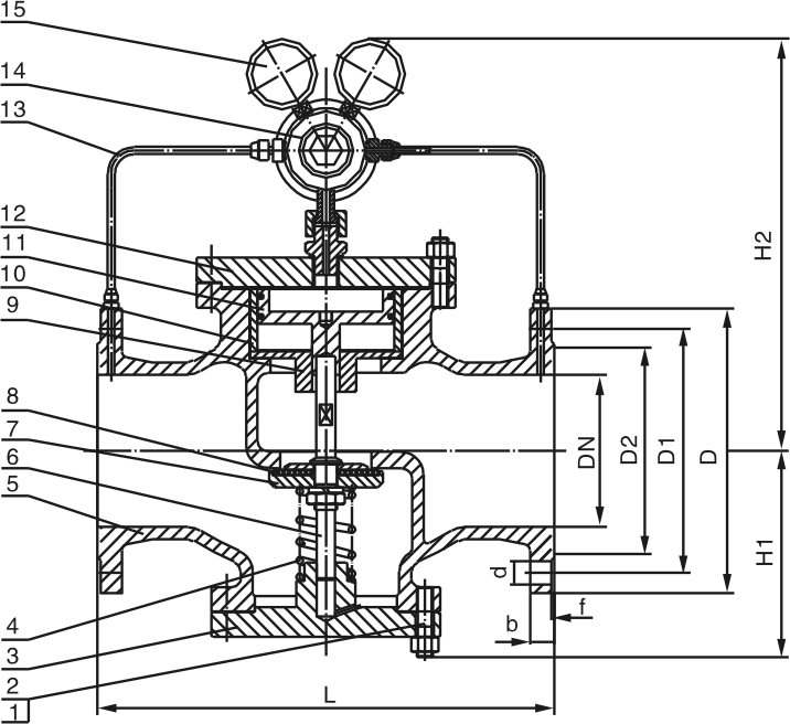 本系列減壓閥屬于先導活塞式減壓閥。由主閥和導閥兩部分組成。主閥主要由閥座主閥盤、活塞、缸套、彈簧等零件組成。導閥主要由閥座、閥瓣、膜片、彈簧、調節彈簧等零件組成。通過調節調節彈簧壓力設定出口壓力,利用膜片傳感出口壓力變化,通過導閥啟閉驅動活塞調節主閥節流部位過流面積的大小,實現減壓穩壓功能。