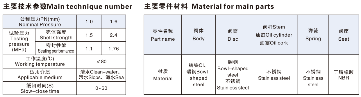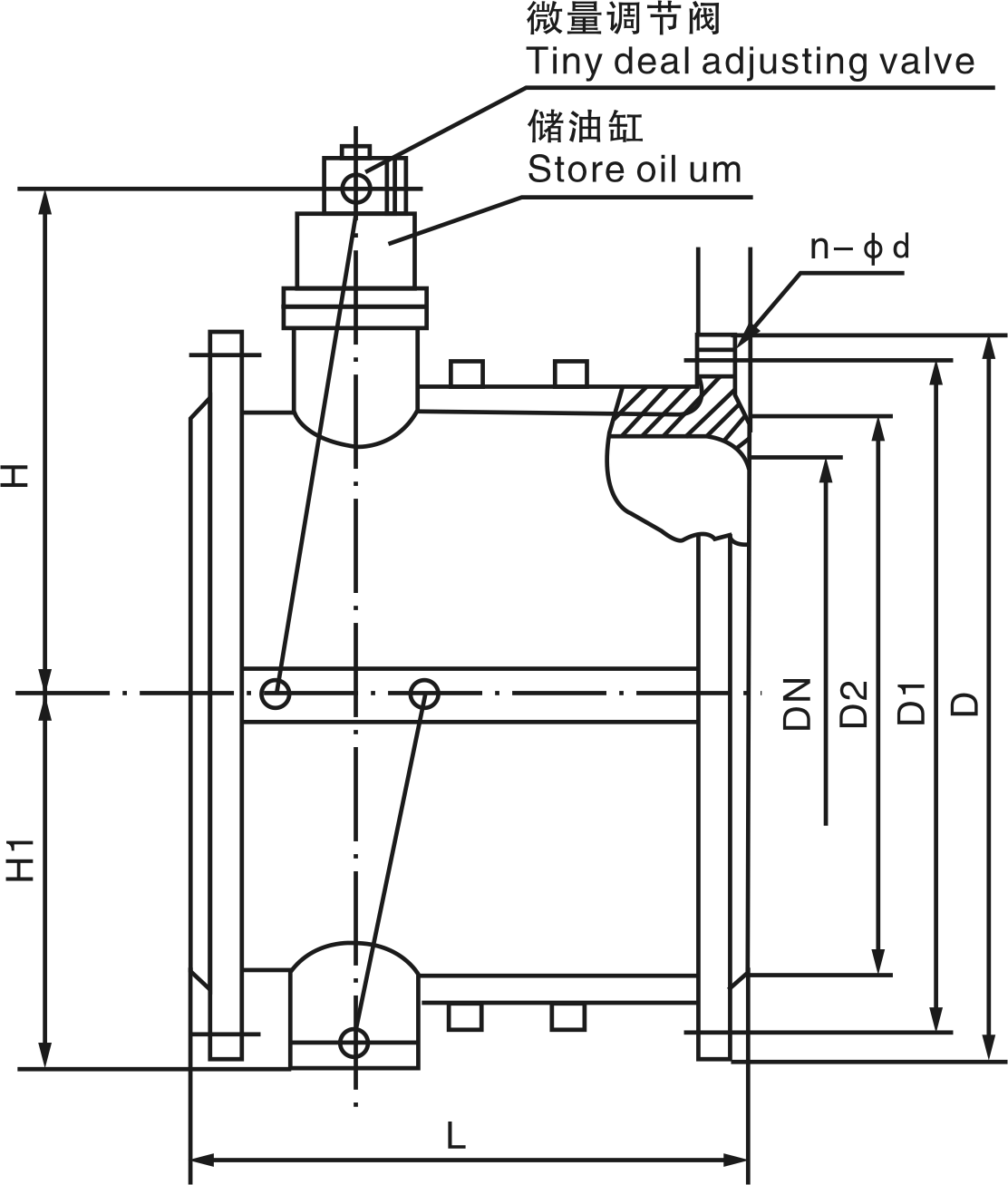 主要由閥體、兩塊半圓閥瓣、回位彈簧、儲油缸、緩閉小氣缸組、針型閥(微量調節閥)組成。其原理主要依靠進口介質的推力作用,將兩塊閥瓣平穩推開。在此同時,進口的壓力介質進入油缸內活塞的下部,推動活塞,將活塞上部的油通過針型閥分別壓入閥體兩側的小氣缸尾端,使小氣缸內的活塞桿伸出。當進口介質壓力下降低于出口壓力時,介質將產生回流,此時閥瓣在彈簧和介質回流的作用下,將自動關閉。但由于活塞桿處于伸出的位置,頂住閥瓣不能全部關閉,還剩有20%左右的面積使介質通過,從而起到了消除水錘的作用。閥瓣被活塞分成先快速關閉后緩慢兩步關閉,達到既防電機逆轉又起消除靜音作用。
